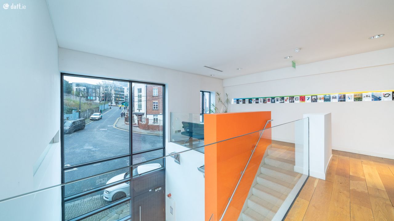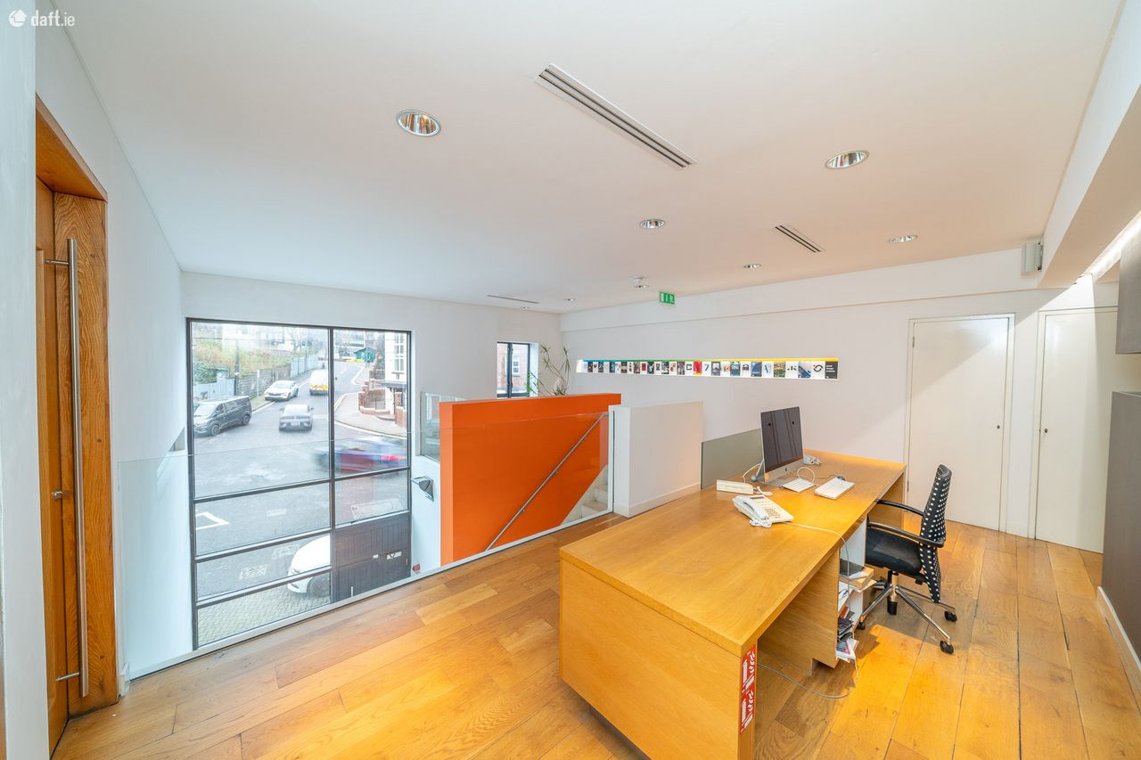 On entering there is a double height atrium with a stone staircase leading up to a bright and space reception area. The reception incorporates a separate waiting area and generous space for a receptionist. The area features oak wood flooring, glass balustrade and recessed lighting. To the right of the reception area is a well-positioned boardroom. This is an impressive light filled space, featured carpet flooring, recessed lighting and air conditioning. Behind the reception is a large bright open plan office. In its current layout, this space incorporates 10 large desks, which does not include a private office space that could easily accommodate two more desks. This room features carpet flooring, office lighting, air conditioning and built in storage. Ancillary to this space is a print room and a staff kitchen. From the kitchen French doors lead out to a large south facing private terrace. The unit incorporates two separate toilets and a shower room.