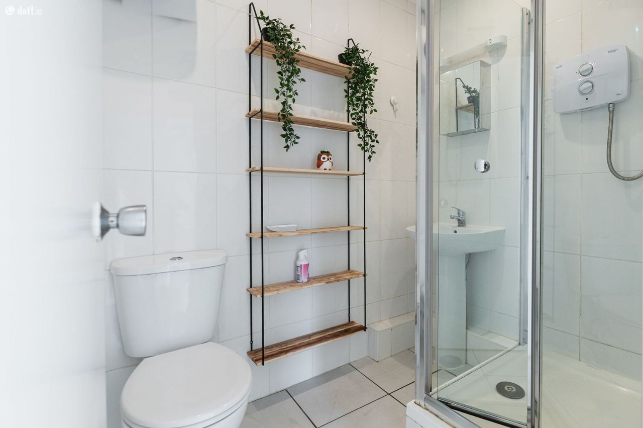 The bathroom is presented in a clean, modern style, complete with full tiling and a contemporary shower enclosure, creating a fresh, functional space.