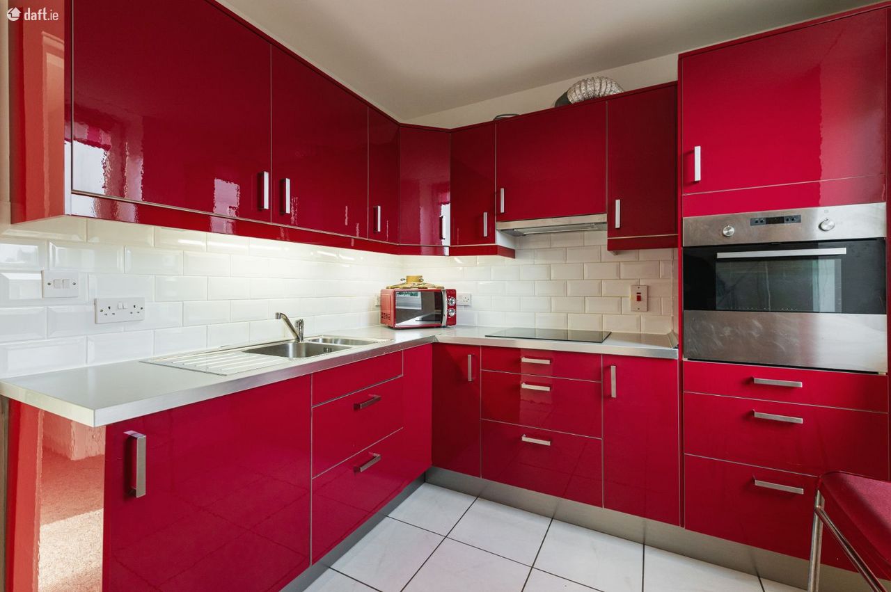 The kitchen is a standout feature, with striking high-gloss red cabinetry, sleek worktops, and crisp white-tiled splashbacks. Fully fitted with integrated appliances, it offers both practicality and a strong modern aesthetic. A bright window aspect further enhances the space, while a breakfast bar provides an ideal spot for casual dining.