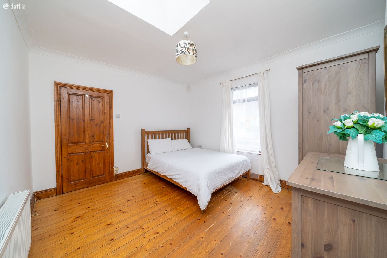 This superb bungalow features an attractive red brick facade opening to an entrance hall with solid wooden floors and ornate coving. The solid floors and ornate coving continue to a spacious bedroom which also features a Velux window. The light filled living room is situated in the middle of the property and boasts high ceilings, solid floors, a Velux window, wall mounted shelving, spotlights and a feature gas fireplace. A tiled hall with a hotpress links the living room to the kitchen. To the left of the hallway is a large room with solid floors, a Velux window and access to the attic. It also incorporates a generous sized ensuite bathroom with a tiled floor, partially tiled walls and an electric shower. This room could have a multitude of uses such as a study, a playroom or a formal dining room. There is a second shower room with a tiled floor and an electric shower. The open plan kitchen and dining area has a tiled floor and plenty of counter & cupboard space. Sliding doors from the dining space open to an impressive paved garden and patio area with a purpose built shed making it an ideal place to relax & entertain. The property also benefits from three parking permits.
