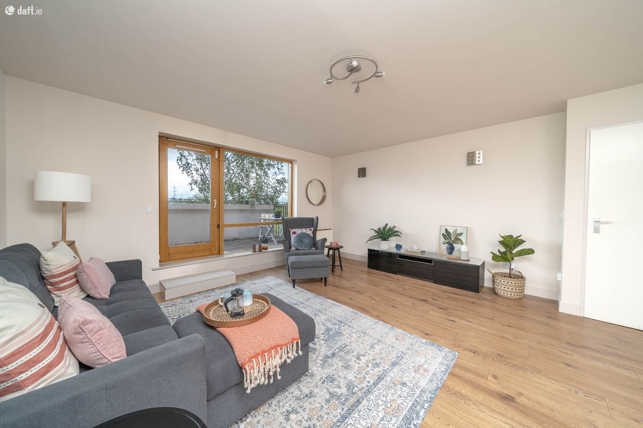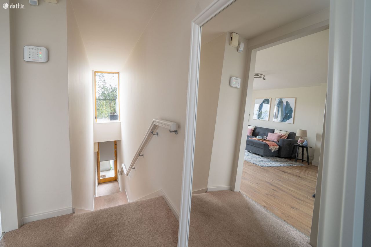 This amazing property is situated over the first and second floors and has an external stairwell leading to an attractive two tone facade. The light filled entrance stairwell boasts high ceilings and comfy carpet. The guest w.c. is located just off the landing and comes with a tiled floor and also incorporates the hotpress. The dual aspect open plan living room, dining area and kitchen enjoys laminate floors, understairs storage and access to a fantastic south west facing paved terrace which is the perfect place to relax & entertain. The high spec L shaped kitchen has splashback subway tiling and plenty of counter & cupboard space. The top floor has carpet flooring leading to two bedrooms, a study room and a family bathroom. The study room is a great size and has a Velux window. There are two spacious bedrooms, one of which features sophisticated fitted wardrobes. The accommodation is completed by a generous size family bathroom with a tiled floor. This stunning duplex also benefits from a designated car space.