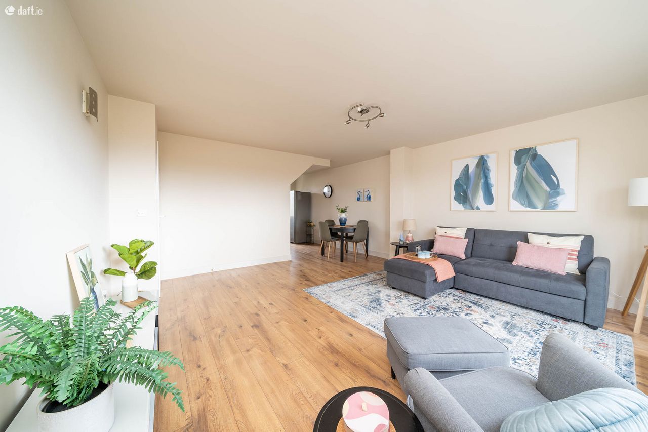 This amazing property is situated over the first and second floors and has an external stairwell leading to an attractive two tone facade. The light filled entrance stairwell boasts high ceilings and comfy carpet. The guest w.c. is located just off the landing and comes with a tiled floor and also incorporates the hotpress. The dual aspect open plan living room, dining area and kitchen enjoys laminate floors, understairs storage and access to a fantastic south west facing paved terrace which is the perfect place to relax & entertain. The high spec L shaped kitchen has splashback subway tiling and plenty of counter & cupboard space. The top floor has carpet flooring leading to two bedrooms, a study room and a family bathroom. The study room is a great size and has a Velux window. There are two spacious bedrooms, one of which features sophisticated fitted wardrobes. The accommodation is completed by a generous size family bathroom with a tiled floor. This stunning duplex also benefits from a designated car space.