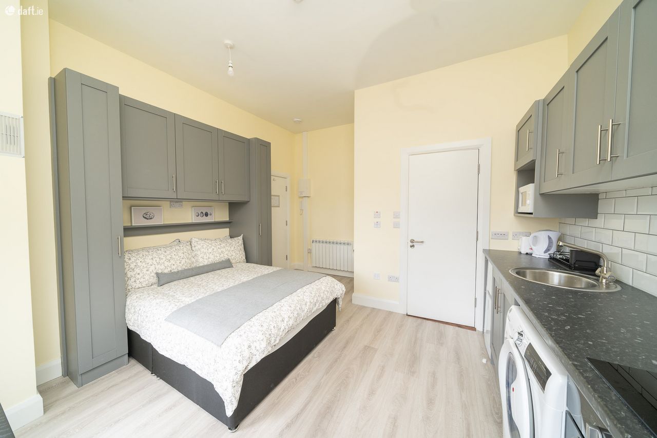 The bathroom is a contemporary oasis, boasting a fully tiled shower area with a modern aesthetic and high-quality sanitary ware. Such luxurious studios are indeed a rarity in the Irish rental market.