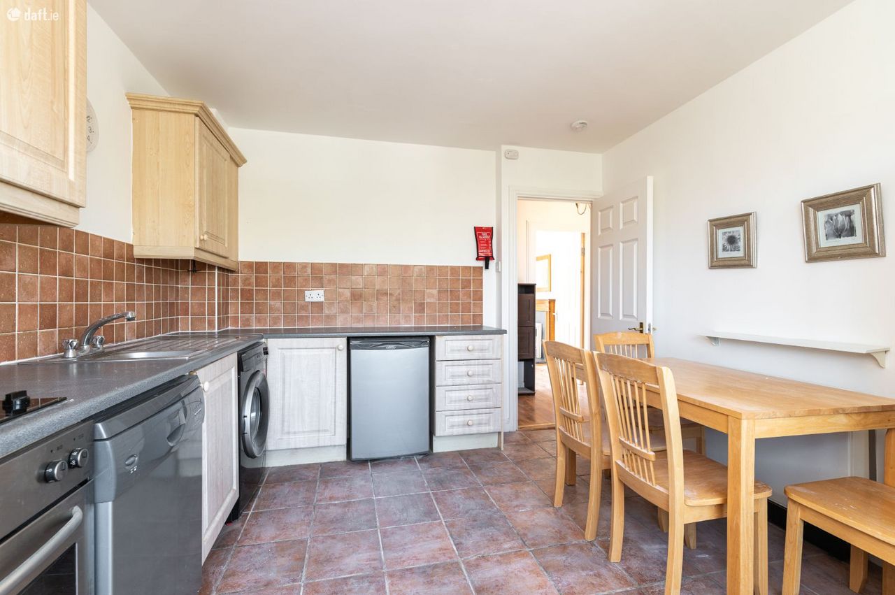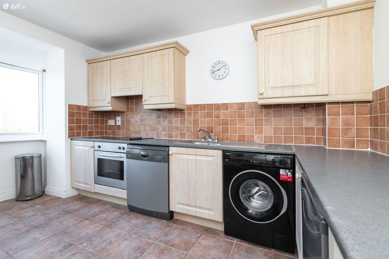 The ground floor features a bright and modern kitchen with tiled flooring, stylish backsplash tiling, integrated appliances, and plenty of countertops and cupboard space. Adjacent to the kitchen is a large double bedroom with laminated flooring, freestanding wardrobes, and ample storage. This bedroom also provides ceiling-to-floor access to a beautiful, light-filled, east-west facing stone-paved patio area overlooking the serene communal landscaped gardens of the development.