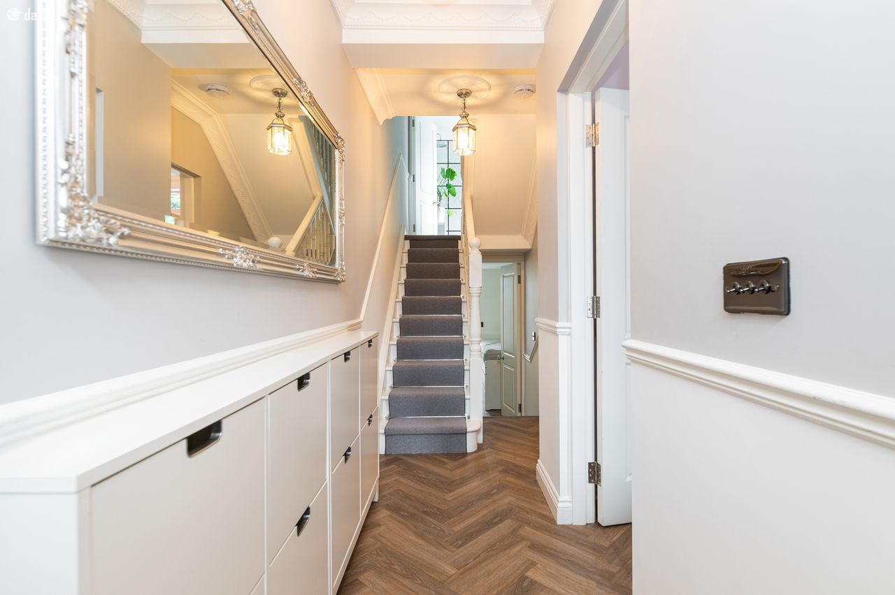 As you step inside, you are greeted by a warm, light-filled entrance hallway featuring soaring ceilings and exquisite chestnut chevron flooring. The space is adorned with opulent furnishings, including a stylish rectangular silver wall mirror and custom-built white storage that perfectly complements the ambiance.
