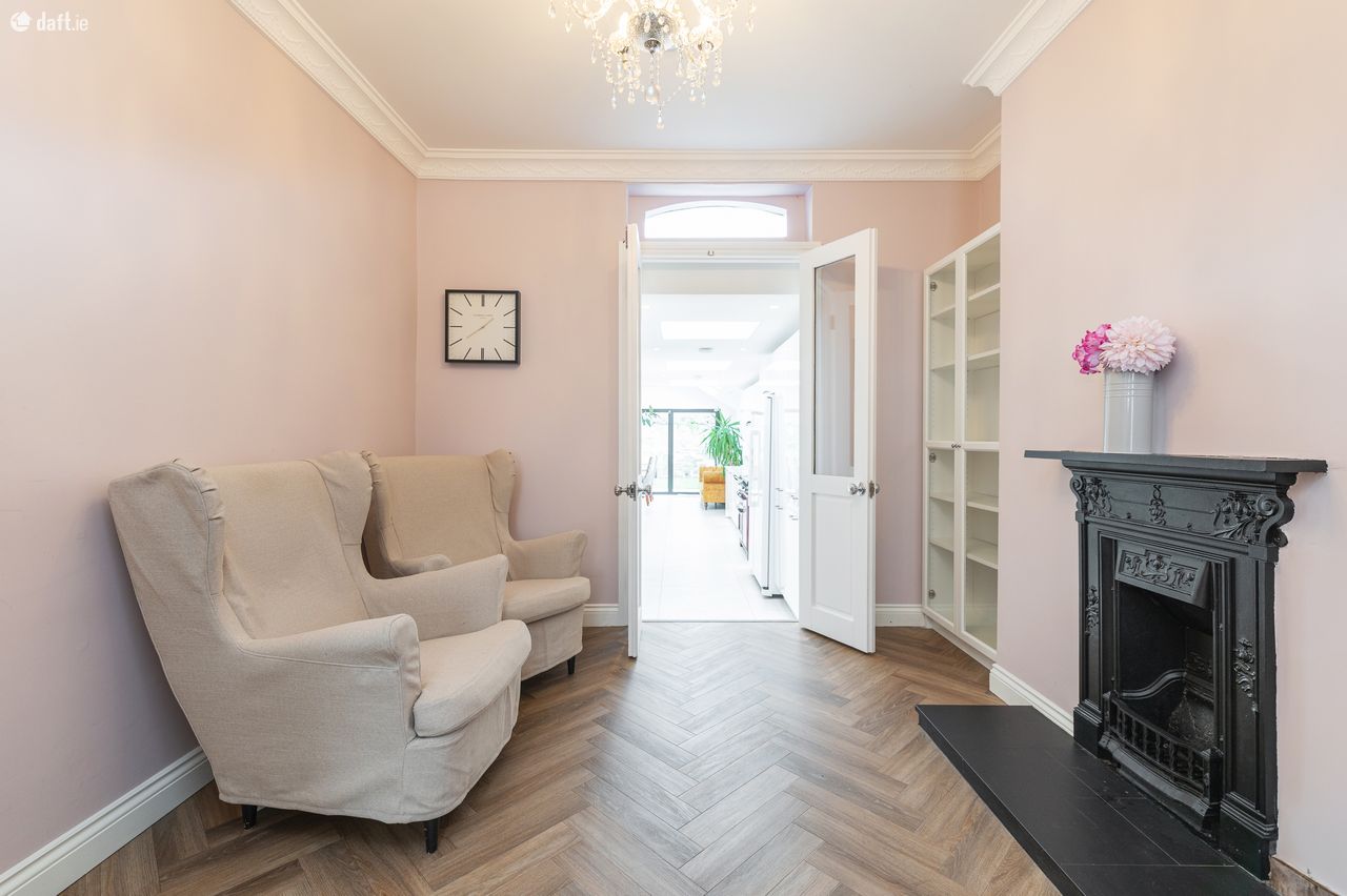 You'll find a charming living area to the right that exudes warmth and sophistication. It has soft pink walls, chic furniture, a captivating fireplace, a refined chandelier, and more beautiful chestnut chevron flooring. Elegant storage solutions nestle seamlessly in the alcoves, enhancing the room's functionality without sacrificing style.