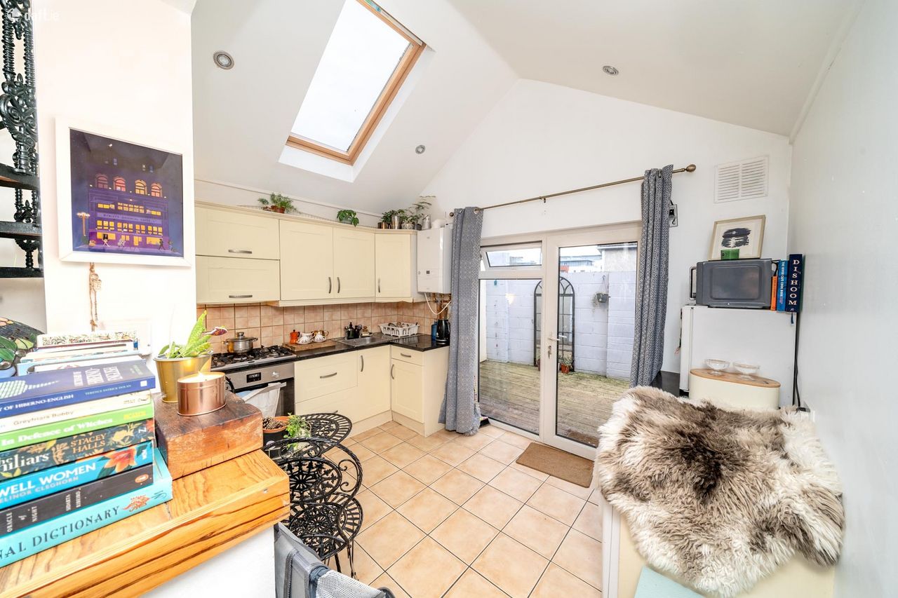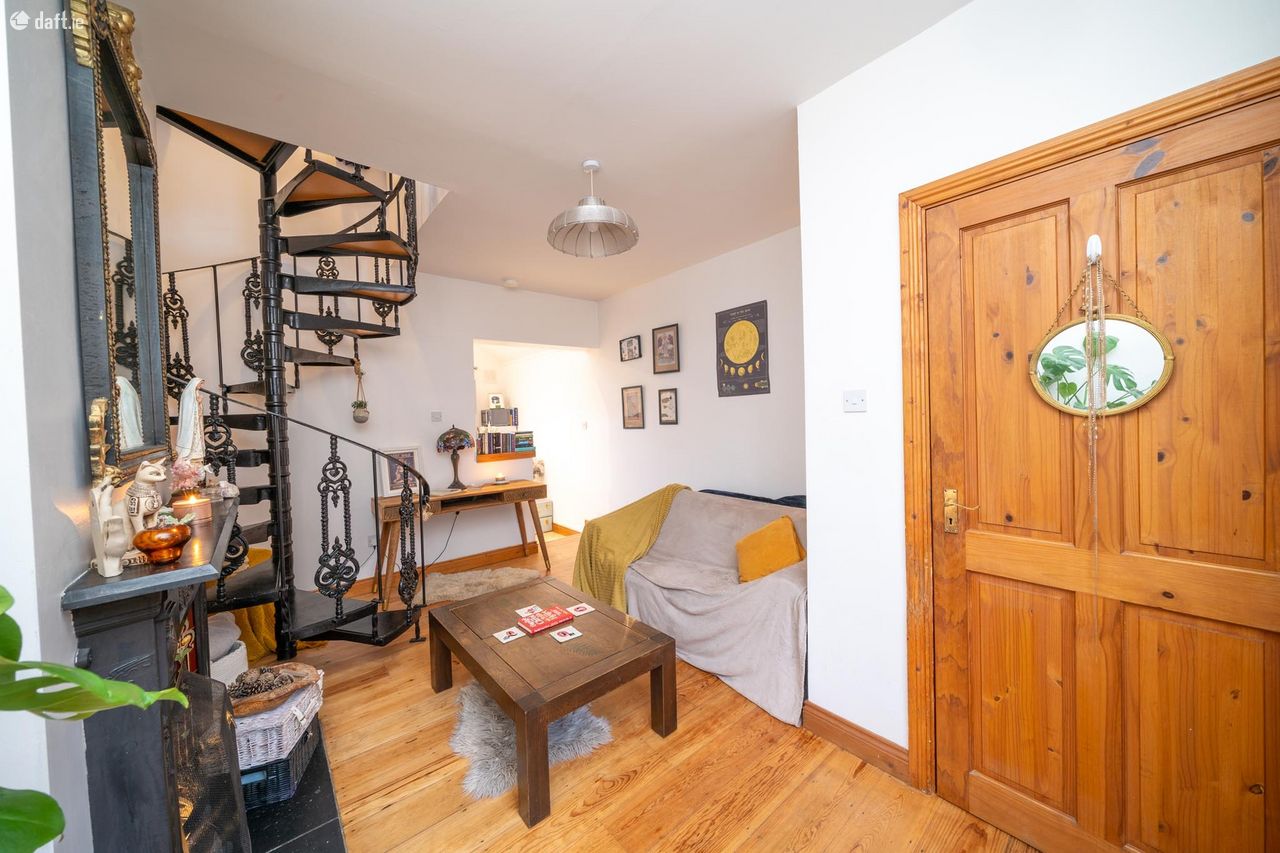 This stylish property features an attractive red brick facade which leads to an entrance hall with laminate floors. The light filled living room boasts a solid fuel fireplace, laminate floors and an eye catching spiral staircase. The open plan kitchen and dining area enjoys a tiled floor, splashback tiling, a Velux window, spotlights and plenty of counter & cupboard space. Glazed doors open to the south facing decked courtyard which has rear pedestrian laneway access and is the ideal place to relax & entertain. Upstairs consists of a dual aspect double bedroom with laminate floors, a hotpress, attic access and storage. The accommodation is completed by a generous sized ensuite with a Velux window, a tiled floor and partially tiled walls. This fantastic home also benefits from free on street parking.