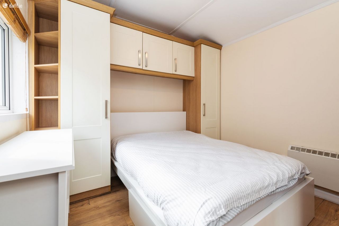 The sleeping area includes a double bed along with extensive built-in wardrobes and overhead storage, providing excellent space for organisation. A separate WC with toilet and wash hand basin completes the accommodation.