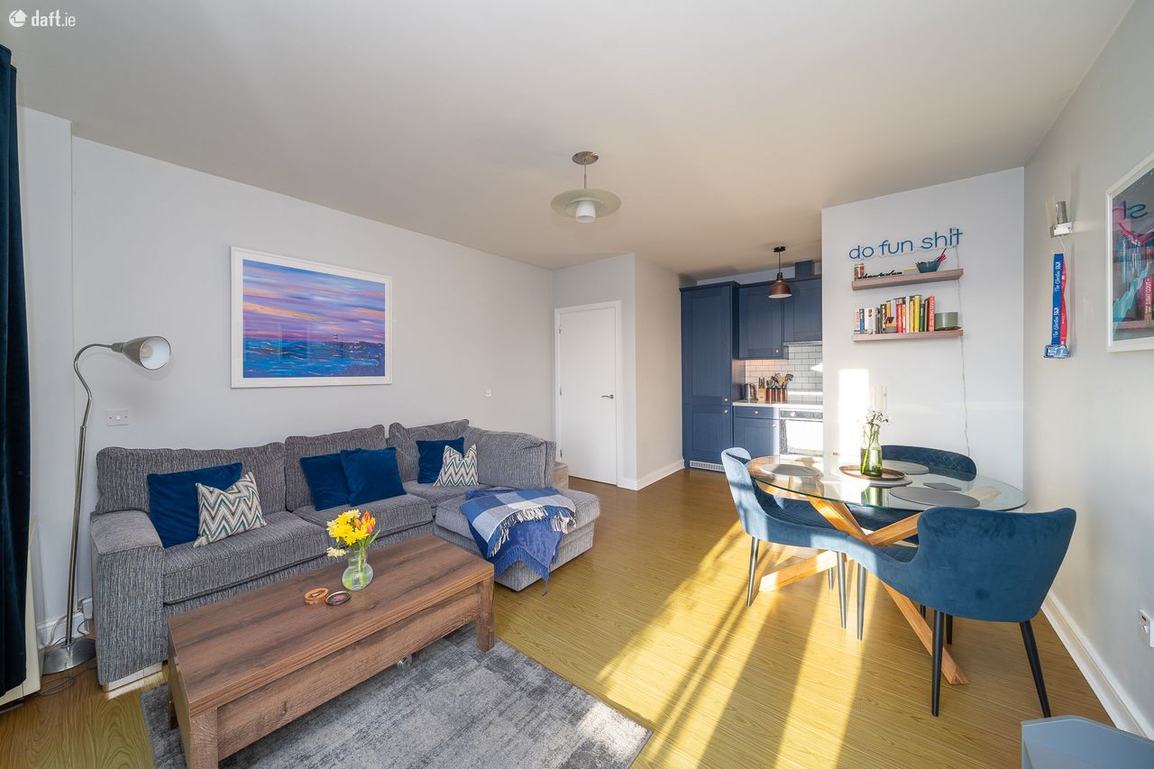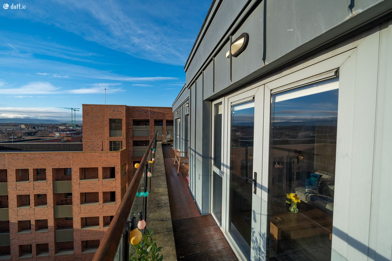 This exceptional sixth-floor apartment features an inviting entrance hall with laminate flooring, two storage rooms, and a hot press. Off the hallway are two bright double bedrooms, both finished with laminate flooring and built-in wardrobes. The main bedroom also enjoys direct access to a large south-facing decked terrace with amazing views of the Dublin Mountains. The generously sized family bathroom is fully tiled and fitted with well-maintained sanitary ware. The light-filled open-plan living and dining area features laminate flooring and double doors leading out to the terrace, creating a wonderful sense of space and flow. Completing the accommodation is an L-shaped kitchen with laminate flooring, tiled splashback, and ample counter and cupboard space. This fantastic apartment benefits from a secure, designated underground car space and lift access.