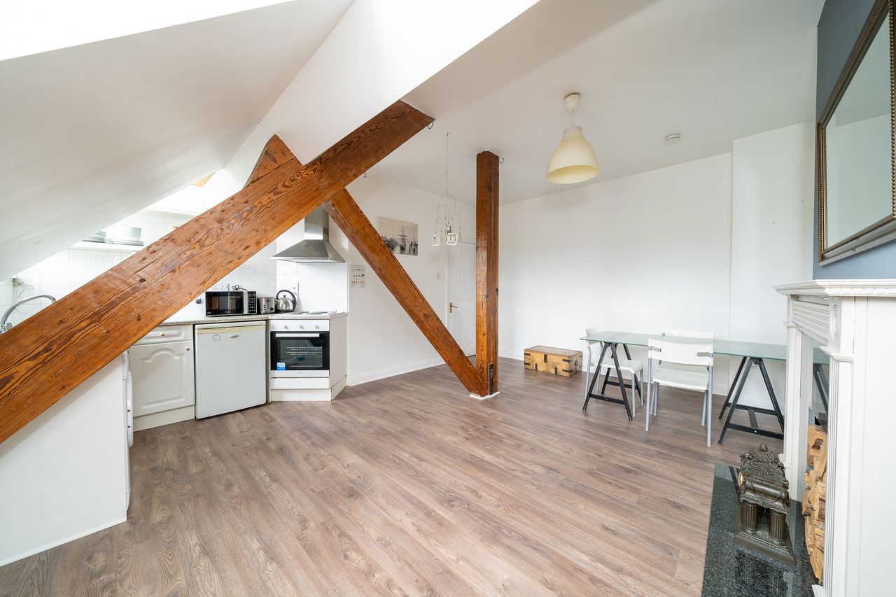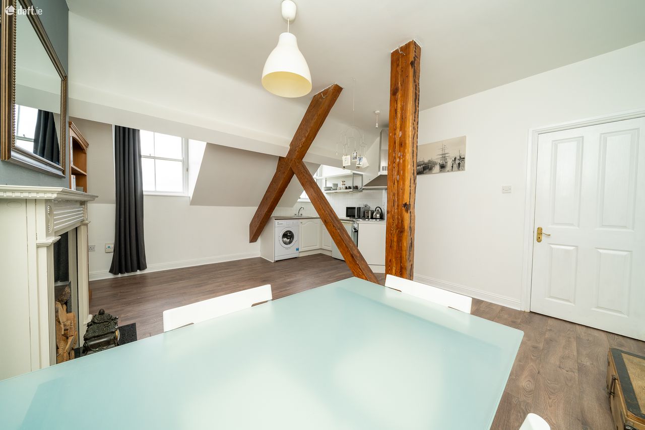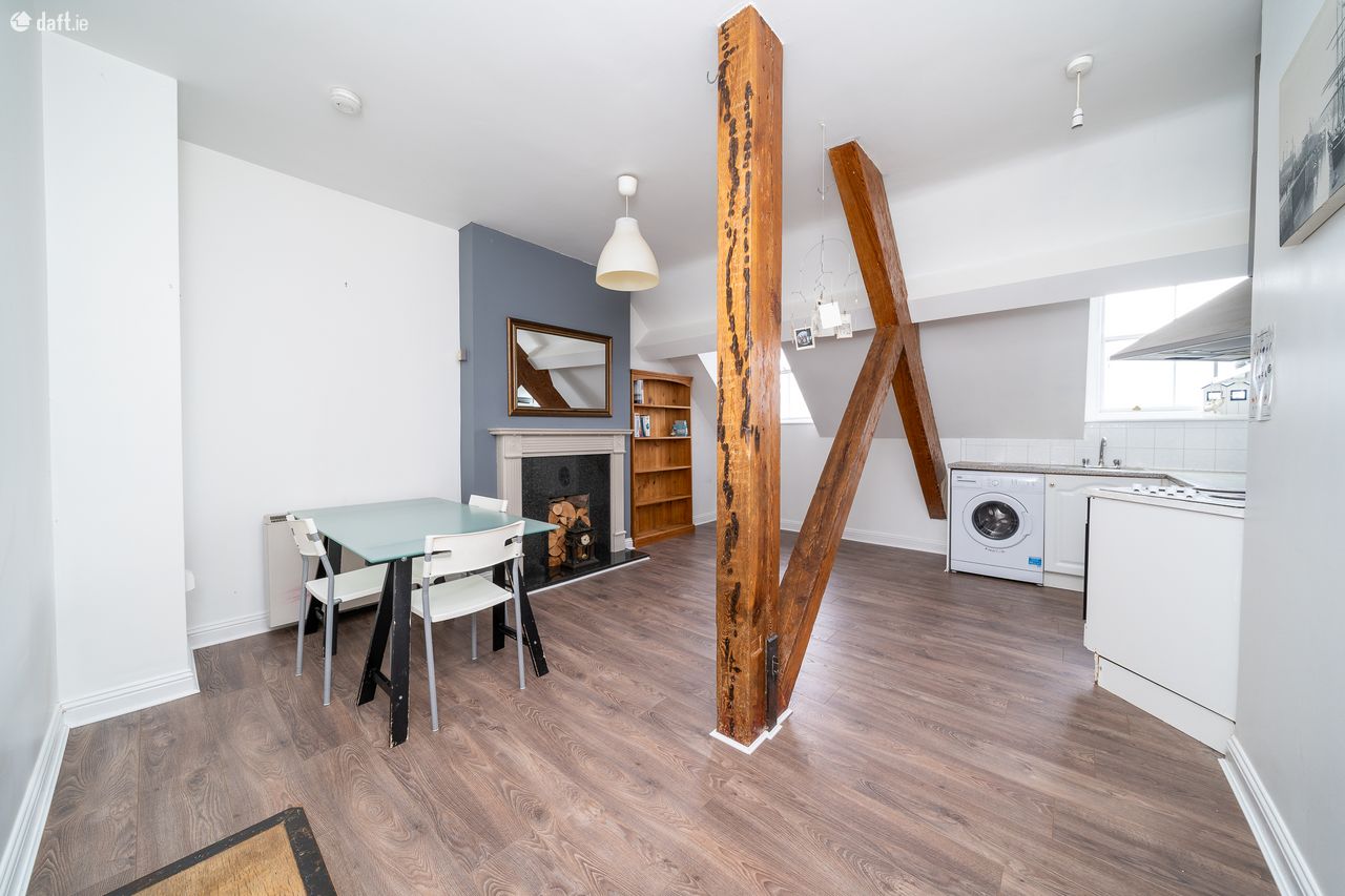 This superb property is located on the third floor and features an entrance hall with access to an attic and new laminate floors which continue throughout the apartment. To the right of the hallway is a spacious double bedroom with a sash window and access to a large home office room with a Velux window, a hotpress and sliderobes. This fantastic space could also double up as a walk in wardrobe. The generous sized family bathroom has a tiled floor and wall mounted storage. The light filled open plan living room, dining area and kitchen boasts eye catching wooden beams, two sash windows overlooking The Dublin Mountains, an ornate fireplace and vaulted ceilings. The kitchen has plenty of counter & cupboard space and splashback tiling. The apartment also benefits from a secure designated car space and is serviced by a lift.
