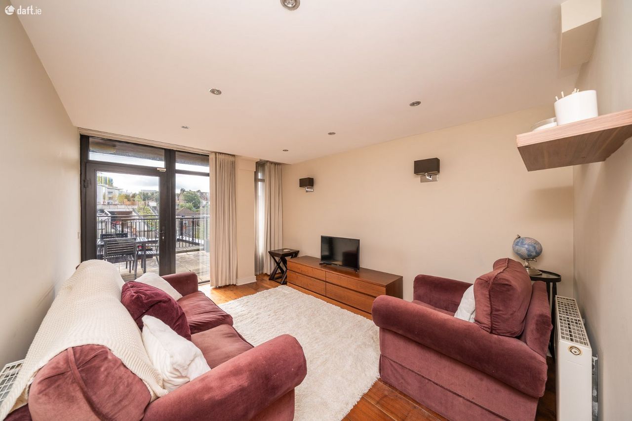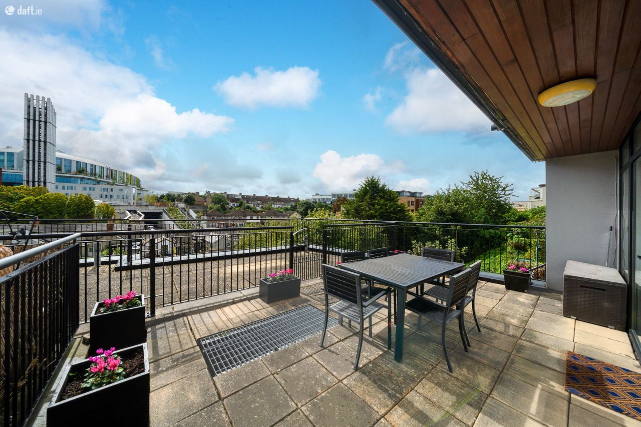 This superb property enjoys own door access which opens to an L shaped entrance hall with solid wooden floors, a storage room, a utility and a hotpress. To the left of the hallway is an open plan fully integrated kitchen & dining area with laminate floors, spotlights and plenty of counter & cupboard space. The light filled living room features wooden floors, spotlights, floor to ceiling windows and access to an amazing south facing terrace overlooking The River Camac. The master bedroom boasts comfy carpet, sophisticated fitted wardrobes and access to the terrace. The second double bedroom also comes with carpet flooring and fitted wardrobes. The accommodation is completed by a high spec fully tiled bathroom with a separate bath & shower and a towel radiator. This stunning apartment also benefits from a secure designated car space and is serviced by a lift.