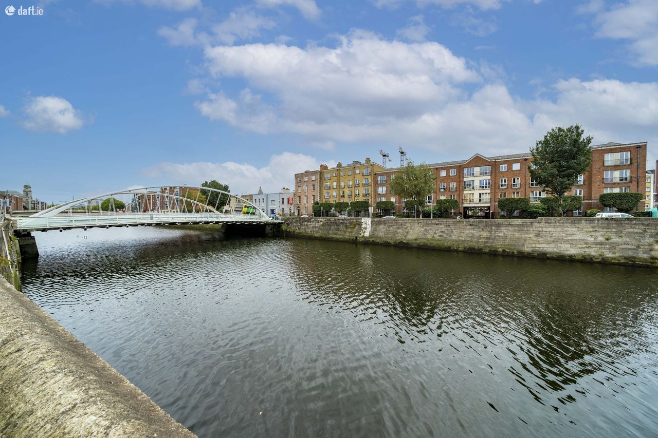 This fantastic property features an L shaped entrance hall with laminate floors. To the right of the hallway is a generous sized family bathroom with a tiled floor, built in storage, a towel radiator and a hotpress. Both double bedrooms enjoy lamimate floors and overlook The River Liffey and James Joyce Bridge, while the main bedroom has sophisticated fitted wardrobes. The light filled open plan living room, dining area and kitchen also comes with laminate floors, ornate coving and large windows overlookng The Liffey making it the perfect place to relax & entertain. The accommodation is completed by a high spec L shaped kitchen with splashback tiling and plenty of counter & cupboard space. The apartment also benefits from a secure designated car space.