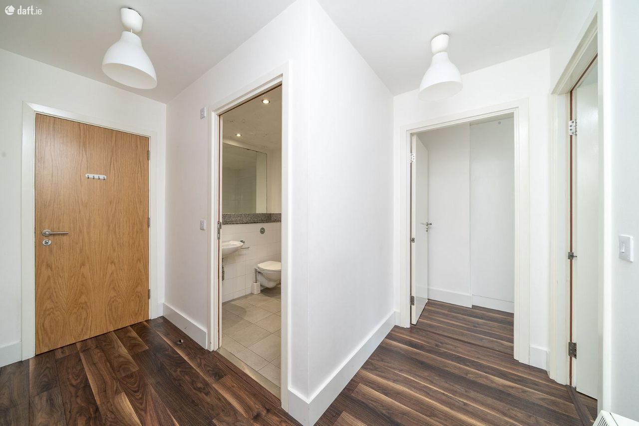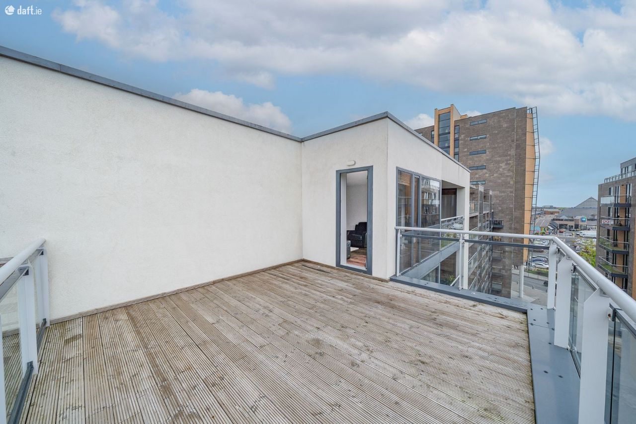 This stunning property features an L shaped entrance hall with laminate floors and a large hotpress & storage room. To the right of the hallway is a generous sized family bathroom with a tiled floor, partially tiled walls, spotlights and high spec sanitary ware. To the right of the hallway is a light filled open plan living room, dining area and kitchen. The stylish fully integrated kitchen boasts a tiled floor and plenty of counter & cupboard space. The living room & dining area enjoys laminate floors, floor to ceiling windows and access to a south east facing balcony and an amazing decked rooftop terrace with unbelievable views of The Dublin Mountains. There are two spacious double bedrooms which both come with sophisticated fitted wardrobes, laminate floors and access to the balcony. This superb property is also serviced by a lift.