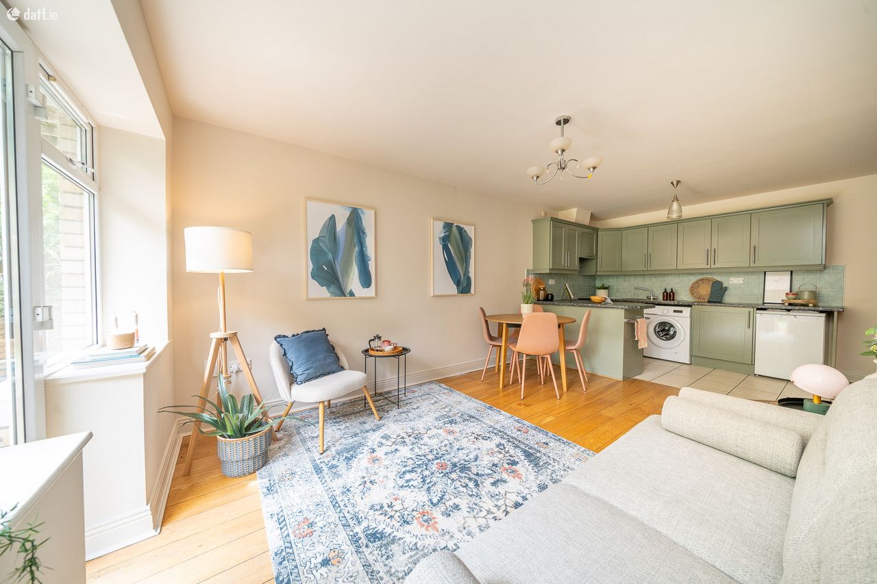 This stunning property enjoys a stylish interior and features an entrance hall with wooden floors and a hotpress. The generous sized family bathroom comes with a tiled floor, partially tiled walls and high spec sanitary ware. There are two spacious double bedrooms with wooden floors and sophisticated fitted wardrobes. The master bedroom incorporates a slick ensuite with a tiled floor and partially tiled walls. The light filled open plan living room, dining area and kitchen is an ideal place to relax & entertain and enjoys access to a south east facing patio and manicured communal gardens. The eye catching U shaped kitchen has a tiled floor, splashback tiling and plenty of counter & cupboard space. This exceptional apartment benefits from two designated car spaces and is serviced by a lift.
