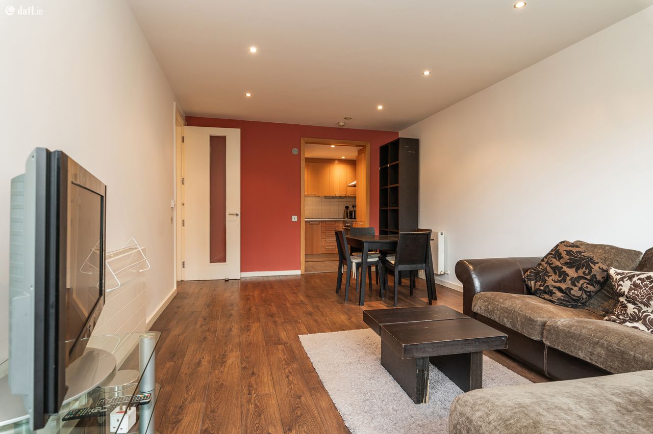 The kitchen is modern in design with splash back tiling, integrated appliances, and plenty of counter-top and cupboard space. Large bright double bedroom with dark wooden flooring, fitted wardrobes, access to balcony and ample storage space throughout. hot-press / storeroom, fully tiled family bathroom with mirror and sanitary ware completes the finish of this must-see apartment. Attractive, spacious external balcony ideal for seasonal relaxation.