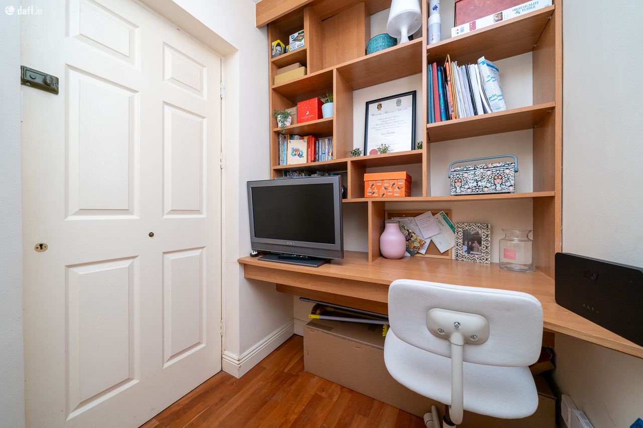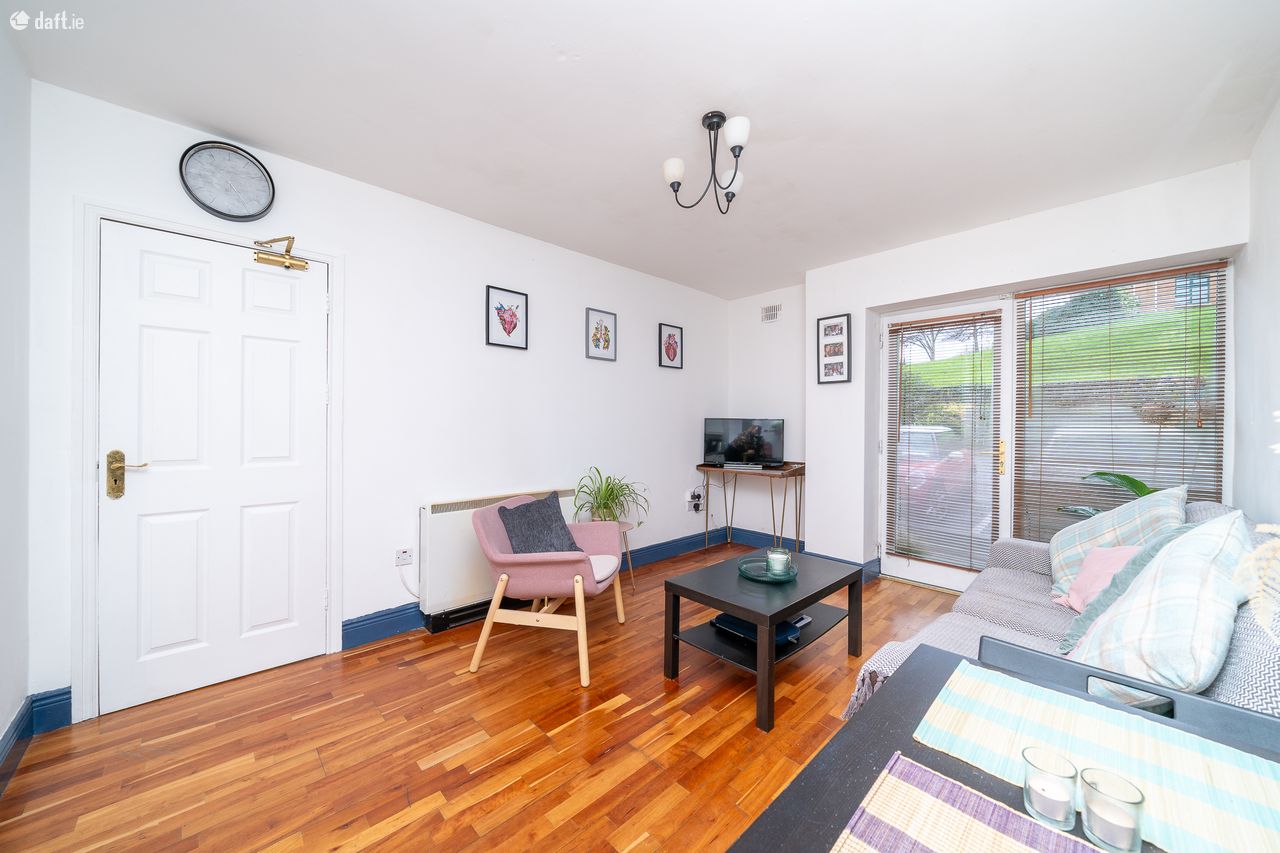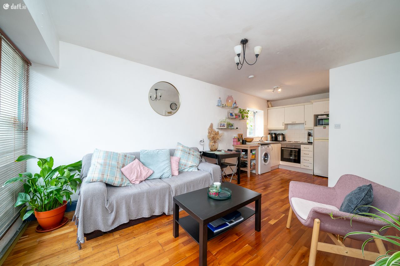 This fantastic property features an entrance hall with semi-solid floors, a hotpress and a clever built in home office unit. To the left of the hallway is a spacious double bedroom with laminate floors and sophisticated fitted wardrobes & presses. To the right of the hall is a generous sized family bathroom with a tiled floor, partially mosaic tiled walls, shelving and an electric shower. The light filled living room, dining area and kitchen enjoys a south west dual aspect. Semi solid floors run through this amazing open plan space which also enjoys double doors to the communal area, shelving, splashback tiling and plenty of counter & cupboard space in the kitchen. The apartment also benefits from permit parking.
