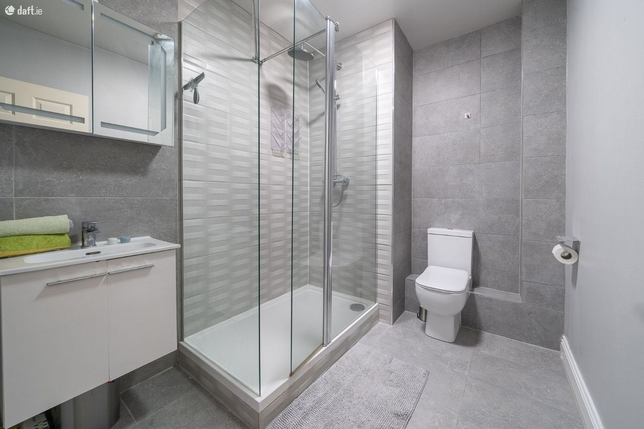 This stylish property features an entrance hall with wooden floors, a hotpress and storage room. The laminate floors continue to both double bedrooms to the right of the hallway. The master bedroom is exceptionally spacious and boasts fitted wardrobes and ornate coving. The second bedroom is currently set up as an ideal home office space. To the left of the hall is generous sized fully tiled family bathroom with high spec sanitary ware, a heated towel radiator and a Monsoon shower. The bright modern open plan living room & dining area enjoys access to a sunny balcony, timber floors and ornate coving. The accommodation is completed by a high spec kitchen with a tiled floor, splashback tiling as well as plenty of cupboard & counter space. The apartment also benefits from a secure designated car space which is serviced by a lift.