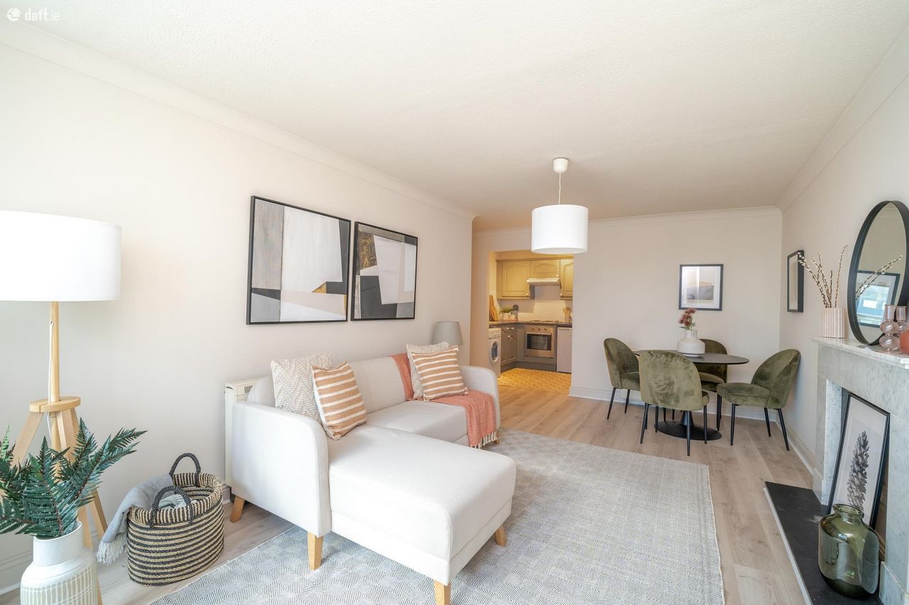 This exceptional property features an L shaped entrance hall with new laminate floors, a hotpress and a storage room. To the right of the hallway is a generous sized family bathroom with a tiled floor and partially tiled walls. There are two spacious light filled double bedrooms with new laminate floors and sophisticated fitted wardrobes. The open plan living room & dining area enjoys laminate floors, a bay window, ornate coving and an ornate fireplace. The accommodation is completed by a high spec L shaped kitchen with splashback tiling and plenty of counter & cupboard space. This amazing apartment also benefits from a secure designated car space which is serviced by a lift.