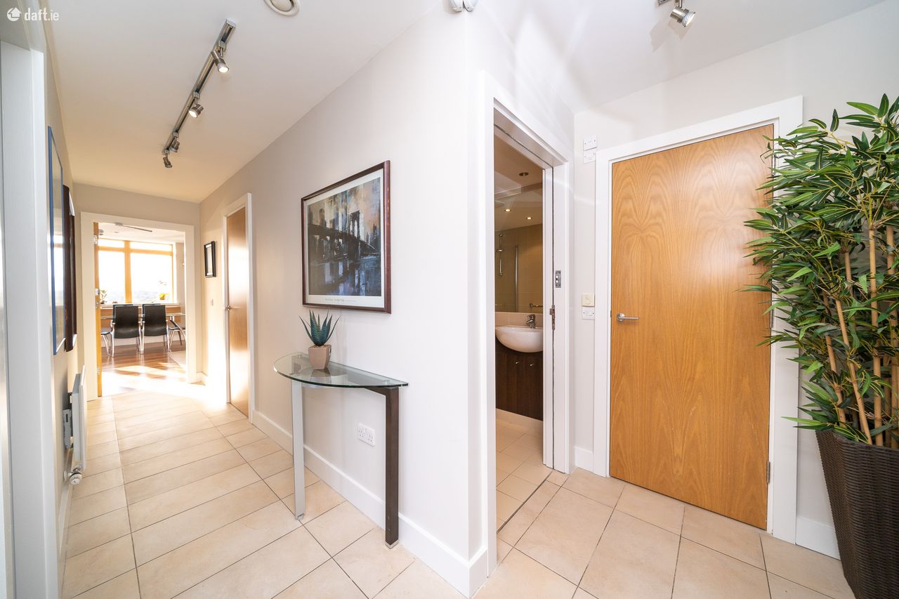 This stunning property was formerly a three bedroom apartment, with the 3rd bedroom incorporated to create a much larger living space. On entering there is a generous entrance hallway with tiled flooring, spray lighting, a storage room and utility room with built in storage. To the right of the hallway is a large fully tiled main bathroom with underfloor heating, under sink storage and a large wall mounted mirror. The spacious master bedroom is carpeted, featuring fitted walnut wardrobes and access to a large decked balcony. The balcony enjoys amazing views of the city skyline, Bully's Acre, The Dublin Mountains and Kilmainham Gaol. The master bedroom also incorporates a stylish fully tiled ensuite with under floor heating. The second double bedroom is carpeted, featuring fitted wardrobes and access to the balcony. The light filled dual aspect living room, dining area and kitchen enjoys a modern open plan layout. The living room & dining area has a mix of wooden floors & carpet, access to the balcony and large south facing windows overlooking Kilmainham Gaol & Dublin Mountains. The fully integrated L shaped kitchen features a tiled flooring, splashback tiling, Quartz counter top and plenty of counter & cupboard space. This outstanding apartment also benefits from an underground designated car space with lift access.