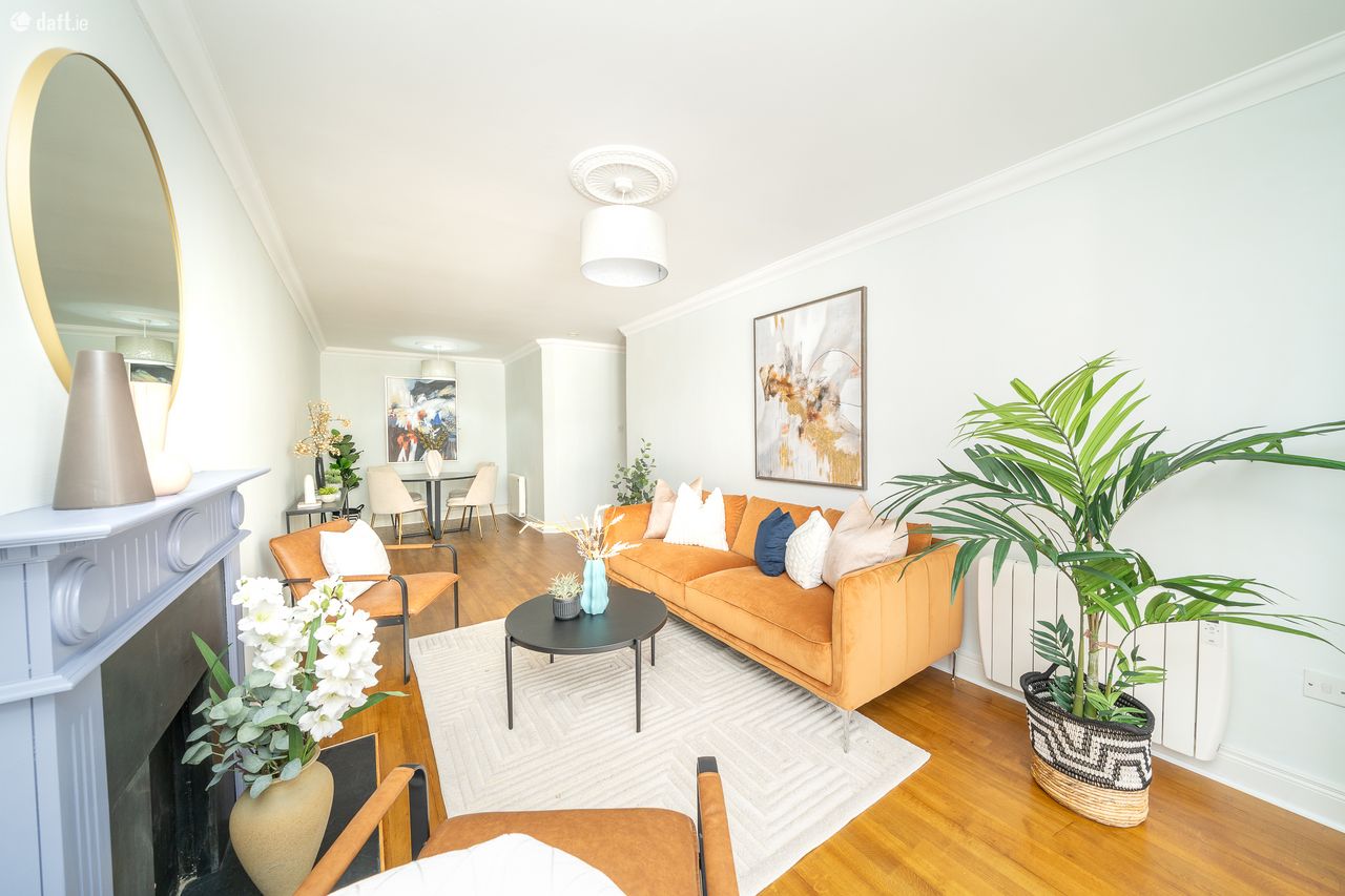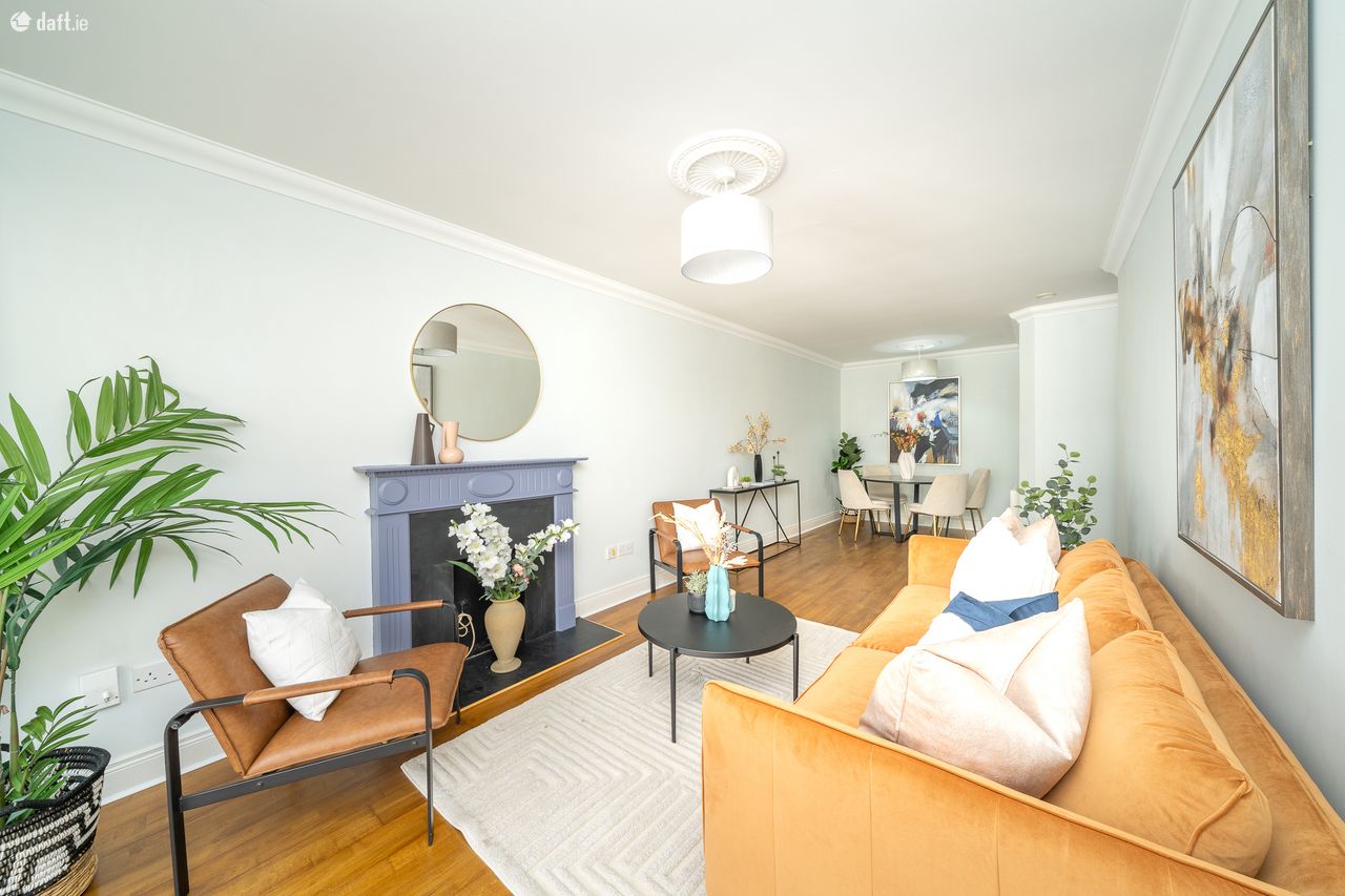 This exceptional property features an L shaped entrance hall with semi-solid floors and ornate coving. The wooden floors continue to the first double bedroom which also boasts sophisticated fitted wardrobes. The generous sized bathroom comes with a tiled floor and incorporates the hotpress. The spacious master bedroom enjoys semi-solid floors, fitted wardrobes and benefits from an ensuite bathroom with a tiled floor and partially tiled walls. The light filled open plan living room and dining area has a storage room, orbate coving, an ornate fireplace and wooden floors. Double doors from the living room open to a sunny balcony making it an ideal place to relax and entertain. The accommodation is completed by an L shaped kitchen with a tiled floor, splashback tiling and plenty of counter & cupboard space. This amazing apartment also benefits from a secure designated car space & bicycle room which is serviced by a lift.