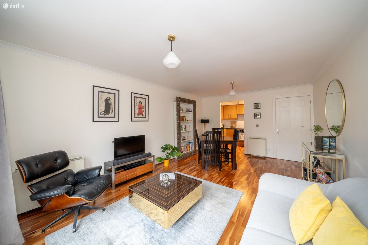 This stunning property features an entrance hall with laminate floors, a hotpress and a storage/utility room. The generous sized family bathroom has a tiled floor, partially tiled walls and high spec sanitary ware. Both double bedrooms enjoy a south east aspect and come with comfy carpet & sophisticated fitted wardrobes. The second bedroom is currently set up as a home office. The laminate floors from the hallway continue to a light filled open plan living room, dining area and kitchen. The spacious living & dining room boasts ornate coving and access to a sunny balcony overlooking The River Camac making it the perfect place to relax. The accommodation is completed by a U shaped kitchen with splashback tiling and plenty of counter & cupboard space. This amazing apartment also benefits from a secure designated underground car space, a communal rooftop terrace and is serviced by a lift.